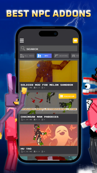 เพิ่มเติมสำหรับ Melon Playground เป็นไดเรกทอรีมอดที่ครอบคลุมที่มีการเสนอชุดเครื่องมือที่หลากหลายเพื่อเสริมความสนุกในโลกเกมของคุณ ด้วยการเลือกมอดที่หลากหลายตั้งแต่อาวุธถึงยานพาหนะและไอเทม แอปพลิเคชันนี้ช่วยให้คุณสร้างฉากเกมที่เป็นเอกลักษณ์และเติมสดให้กับการผจญภัยของคุณอย่างง่ายดาย